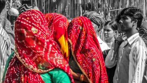 Les femmes s’habillent en Ghagra, Choli et Odhni, ornés de broderies et miroirs étincelants